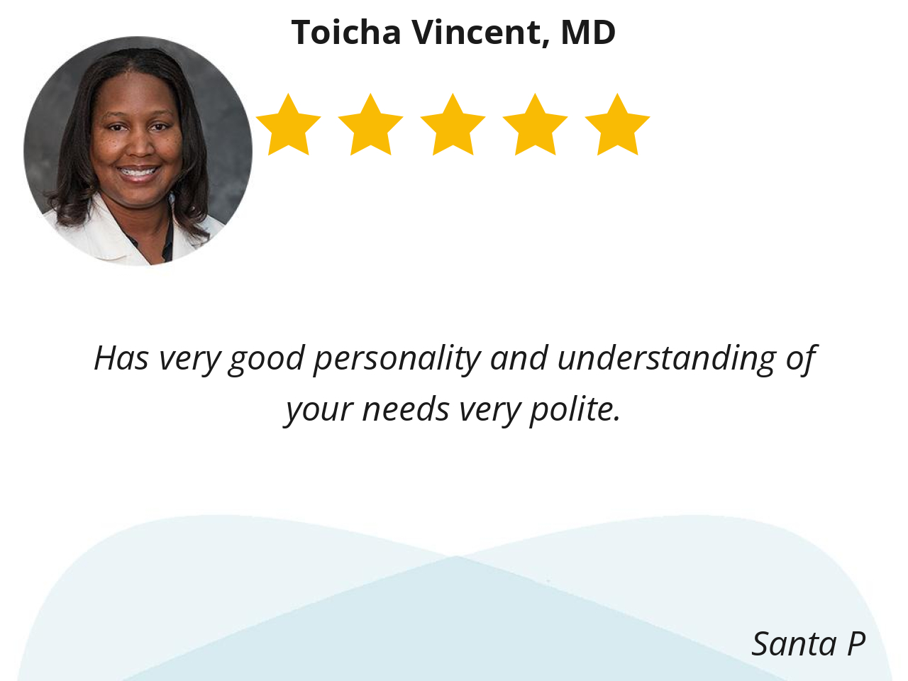 Dr Vincent has been 💯 in a million ways. She’s understands patiently to your question and throughout your entire visit she’s so compassionate with you. Very knowledgeable medically and she really is concerned with your well being. I appreciate Dr Vincent and Thank her so much..