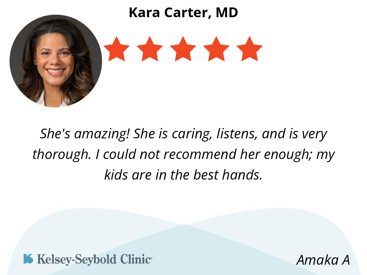 We love Dr. Carter. She has been my daughter’s doctor since she was an infant and my daughter is 15 now. Dr. Carter is very nice and knowledgeable. My daughter’s baby sitter recommended Dr. Carter to me because she was her sons’ pediatrician. Likewise, I would definitely recommend Dr. Carter.