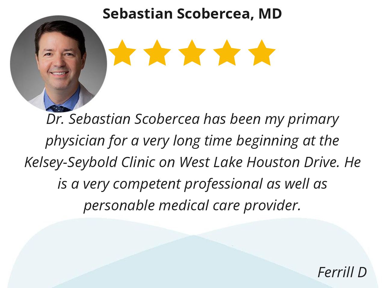 Dr. Sebastian Scobercea has been my primary physician for a very long time beginning at the Kelsey-Seybold Clinic on West Lake Houston Drive. He is a very competent professional as well as personable medical care provider.