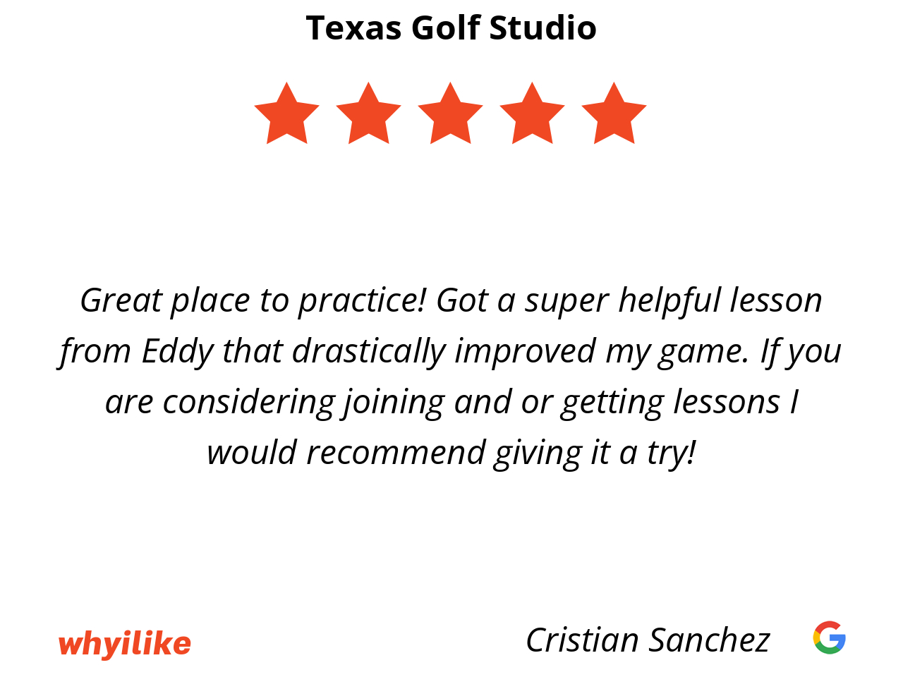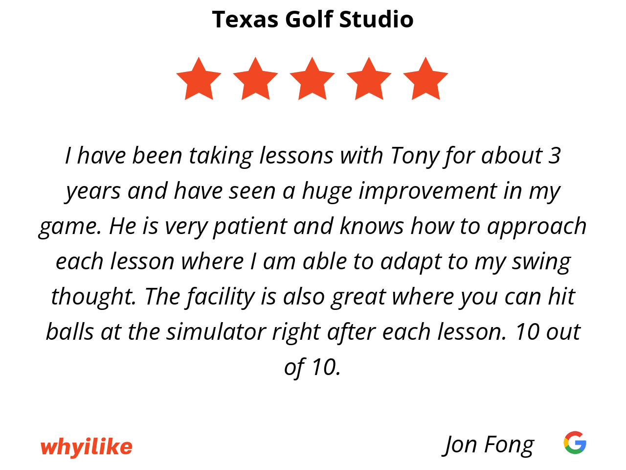 Texas Golf Studio is exactly the experience I was looking for to improve my golf game. Tony is an excellent coach. He is very patient and thorough in his one on one lessons. I feel the price is good for the amount of attention I receive. The studio is always clean and has great technology. Highly recommend.