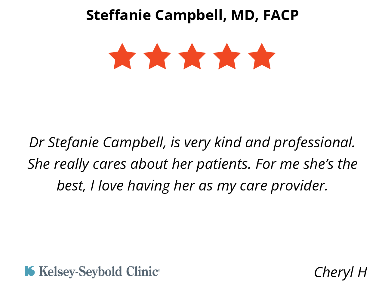 Dr Stefanie Campbell, is very kind and professional. She really cares about her patients. For me she’s the best, I love having her as my care provider.