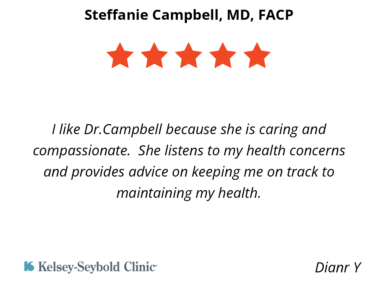 I like Dr.Campbell because she is caring and compassionate. She listens to my health concerns and provides advice on keeping me on track to maintaining my health.