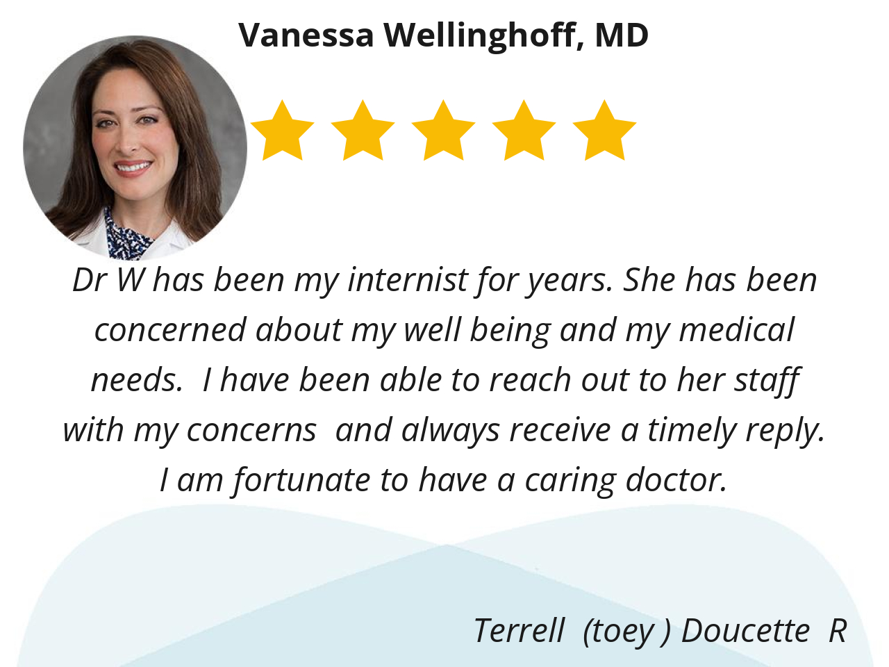 After 77 years of seeing Doctor's, Dr Wellinghoff is by far the #1 Doctor. She is very interested in her patients and takes time with her patients and explains any health issues . Vanessa is a delight to see.