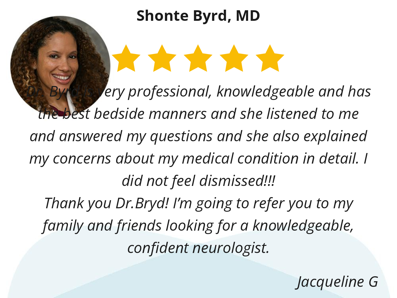 Thank you Dr.Bryd! I’m going to refer you to my family and friends looking for a knowledgeable, confident neurologist.