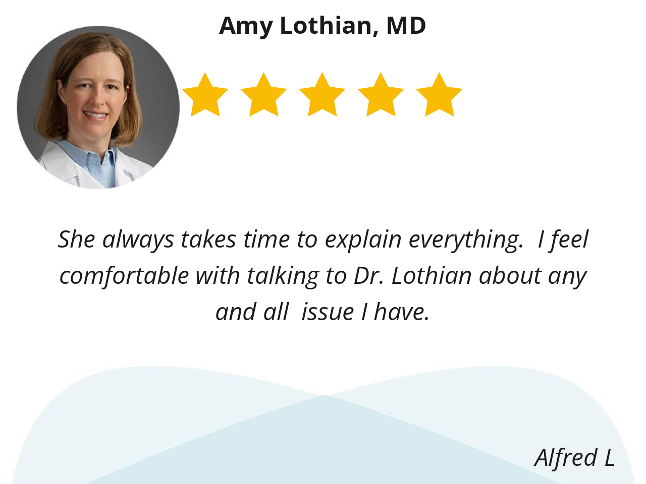 She always takes time to explain everything. I feel comfortable with talking to Dr. Lothian about any and all issue I have.