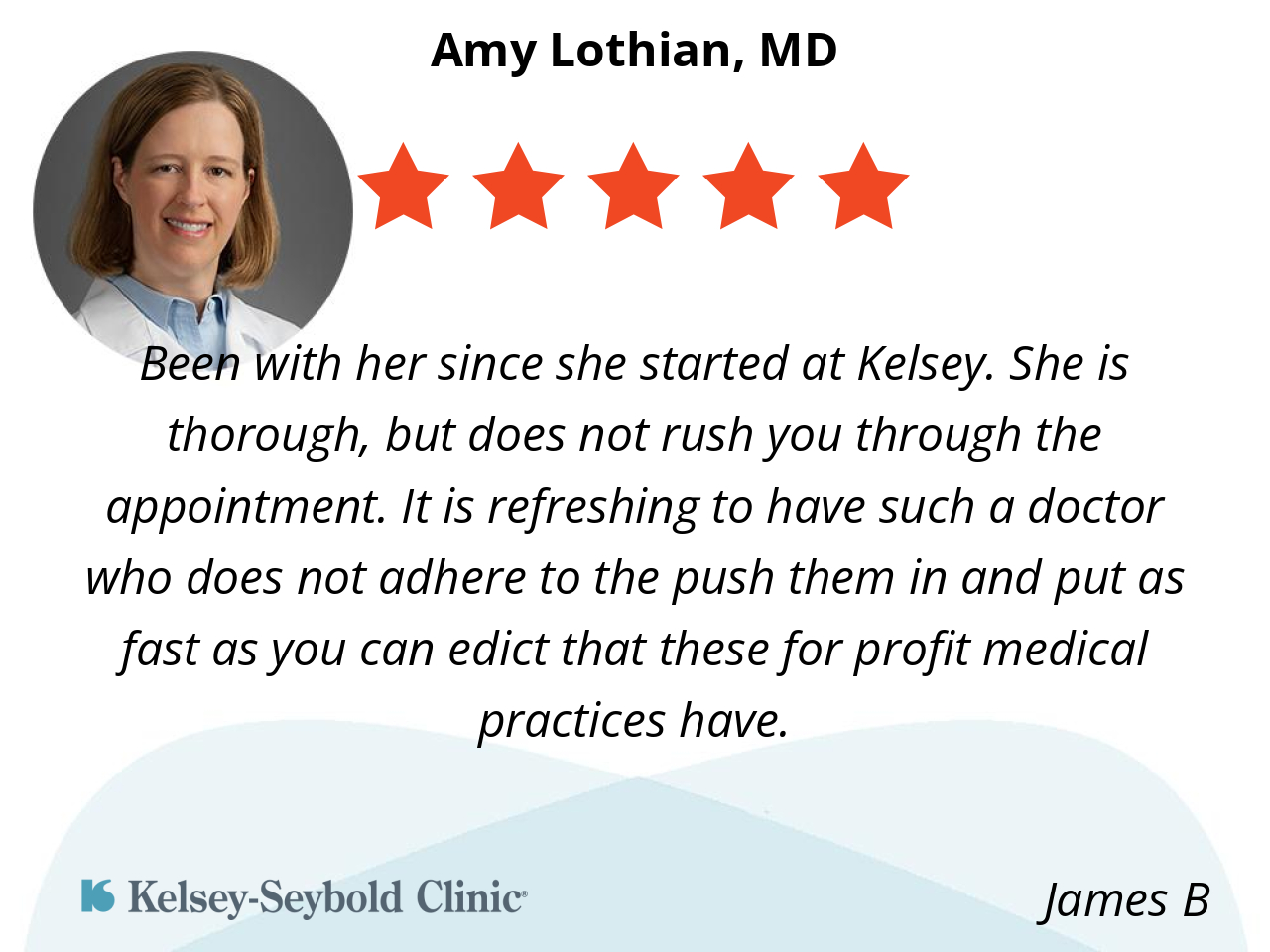 Been with her since she started at Kelsey. She is thorough, but does not rush you through the appointment. It is refreshing to have such a doctor who does not adhere to the push them in and put as fast as you can edict that these for profit medical practices have.