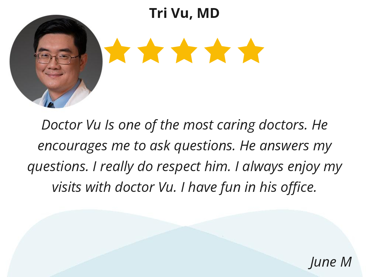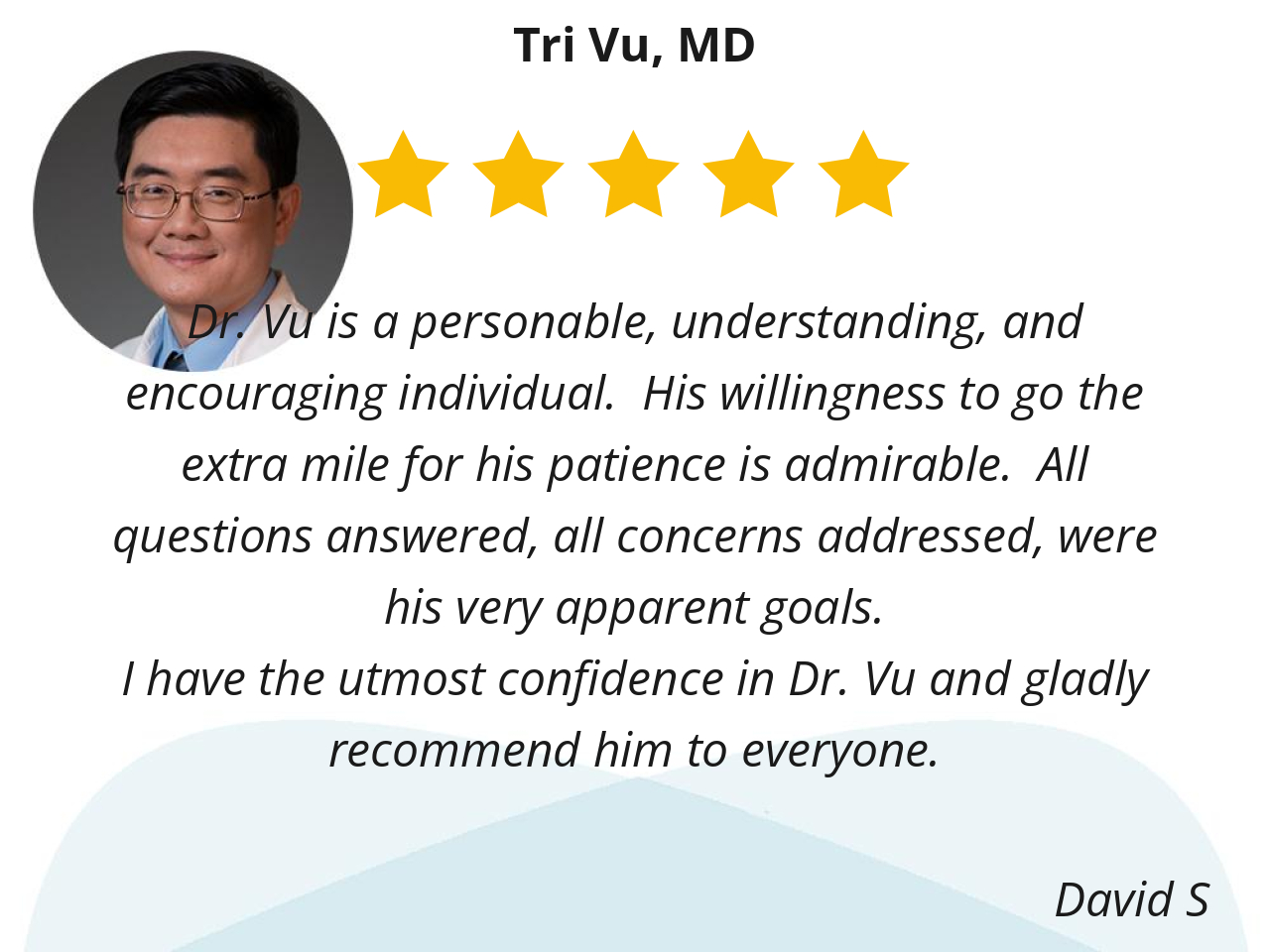 Dr Tri Vu was very supportive, friendly, compassionate, and encouraging. He filled me with great information about my condition. I felt at ease with him. He was polite, humorous and patient answering my concerns. Great service.