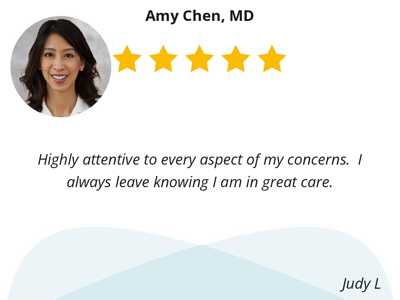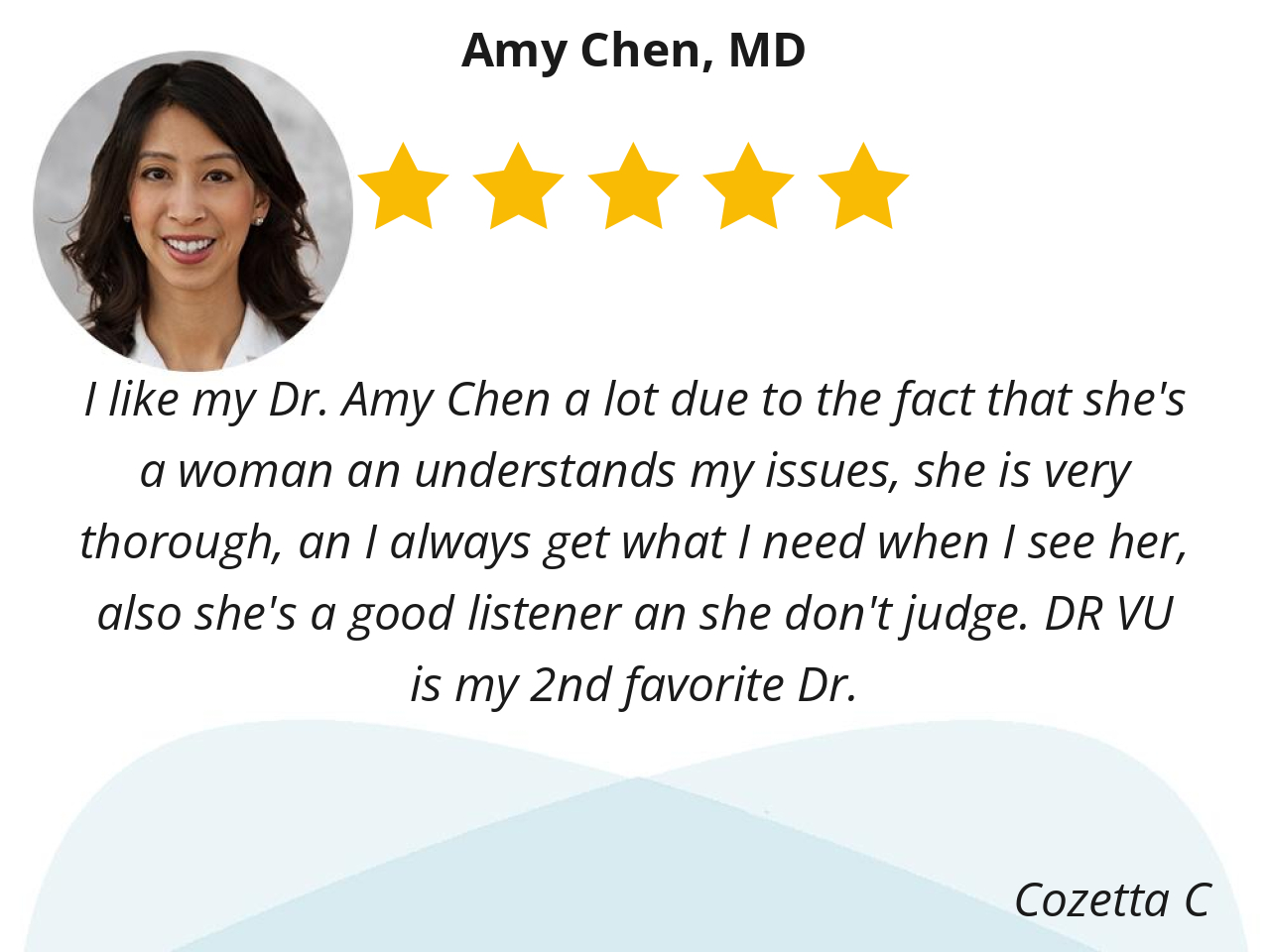 I like my Dr. Amy Chen a lot due to the fact that she's a woman an understands my issues, she is very thorough, an I always get what I need when I see her, also she's a good listener an she don't judge. DR VU is my 2nd favorite Dr.