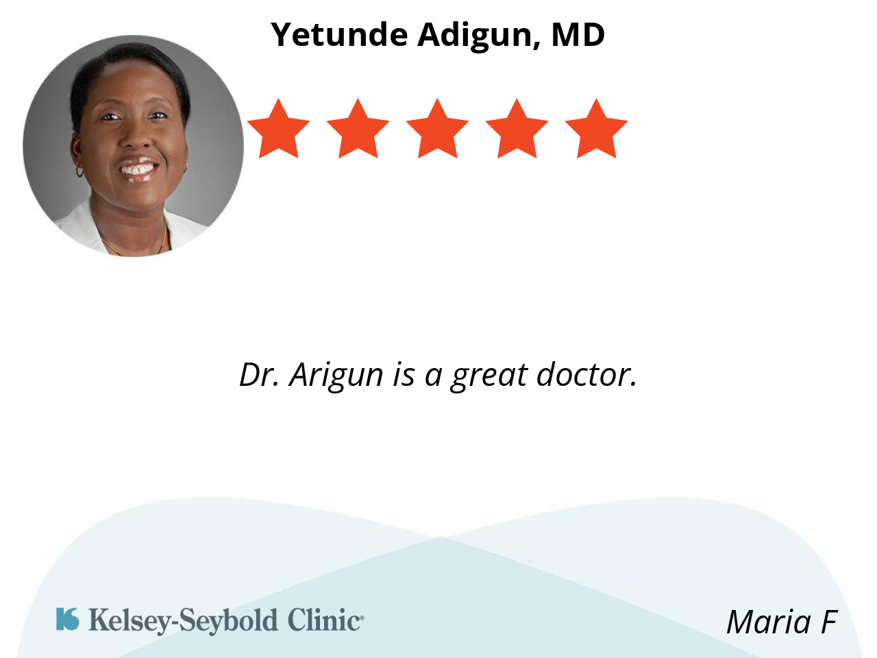 Dr. Adigun is wonderful. Her bedside manner is always personalized, and she consistently makes me feel heard and cared for. I’m truly grateful to have her as my doctor.