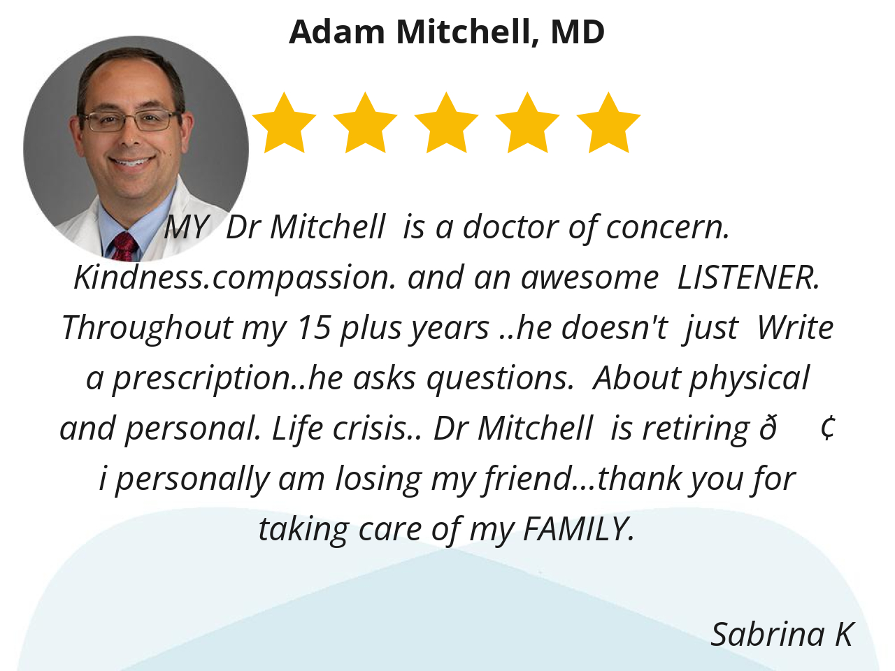 MY Dr Mitchell is a doctor of concern. Kindness.compassion. and an awesome LISTENER. Throughout my 15 plus years ..he doesn't just Write a prescription..he asks questions. About physical and personal. Life crisis.. Dr Mitchell is retiring 😢 i personally am losing my friend...thank you for taking care of my FAMILY.