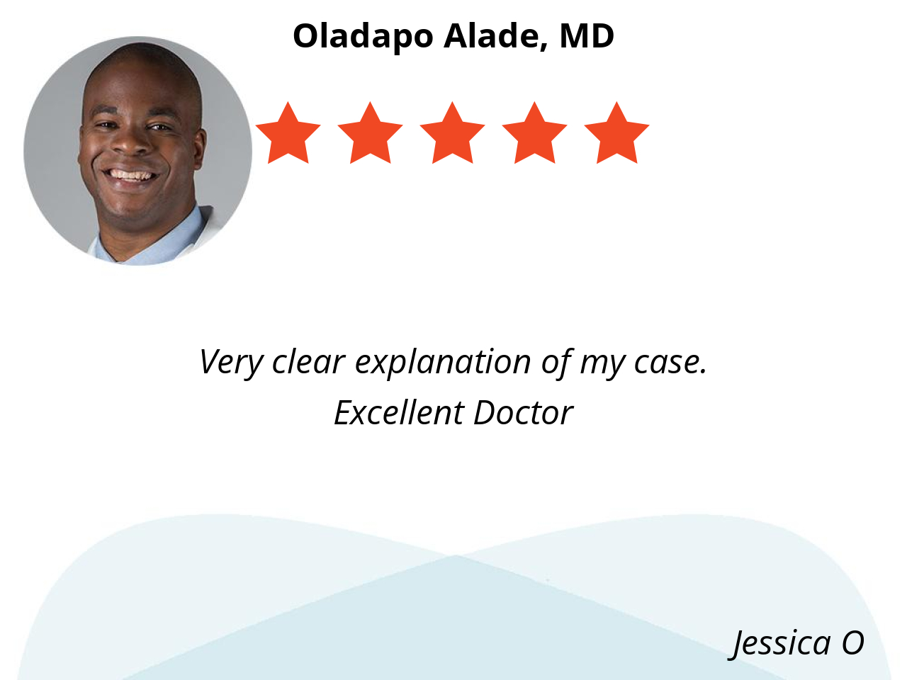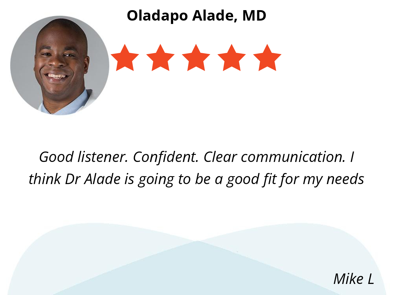 Good listener. Confident. Clear communication. I think Dr Alade is going to be a good fit for my needs