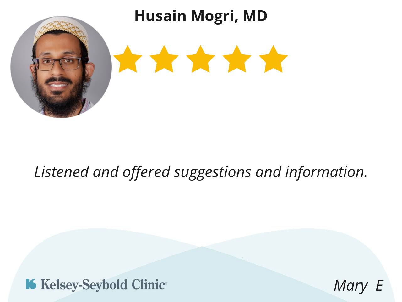 Because Dr. Mogri always seems to pay close attention to what is wrong! He is very easy to talk to, and I like him! Also, he usually has a good answer to medical problems!
