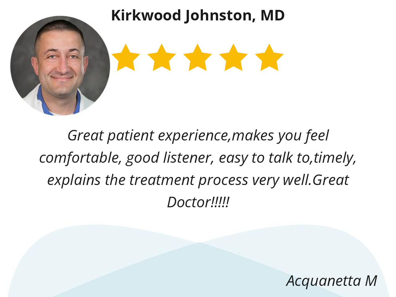 Dr Johnston was able to diagnose my problem and he was able to treat my issue. Great sense of humor and he really cares about his patients. He does not keep his patients waiting in the exam room for a long time.