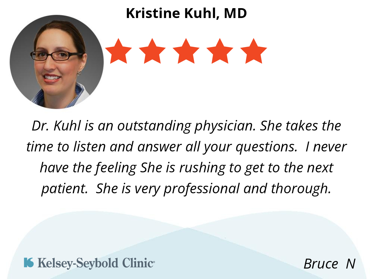 Dr. Kuhl is an outstanding physician. She takes the time to listen and answer all your questions. I never have the feeling She is rushing to get to the next patient. She is very professional and thorough.