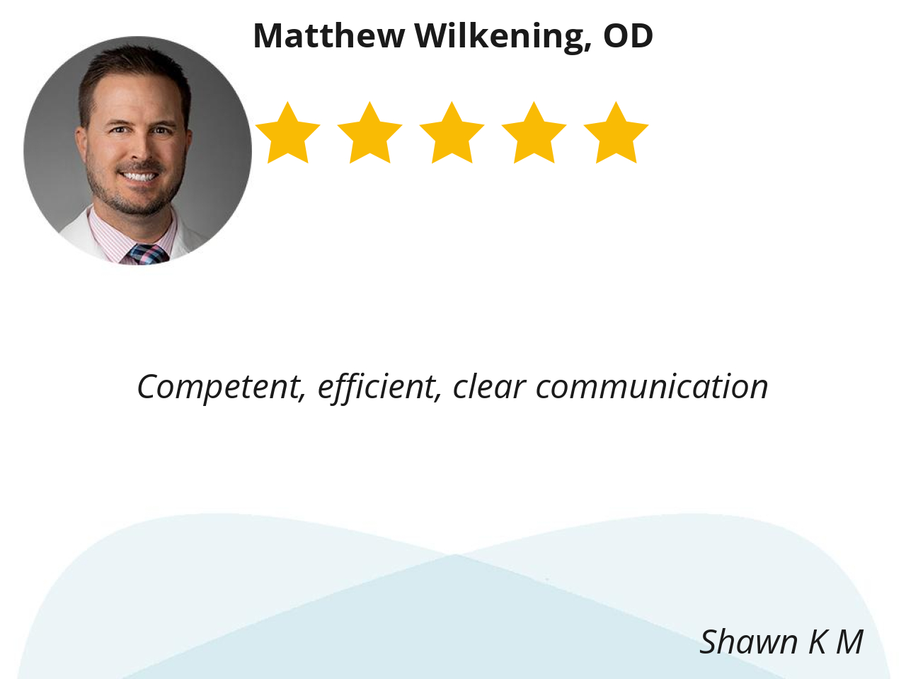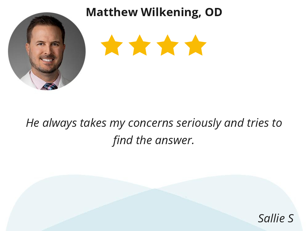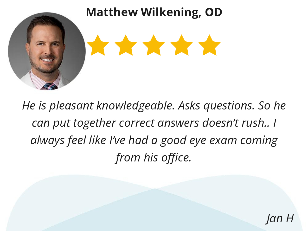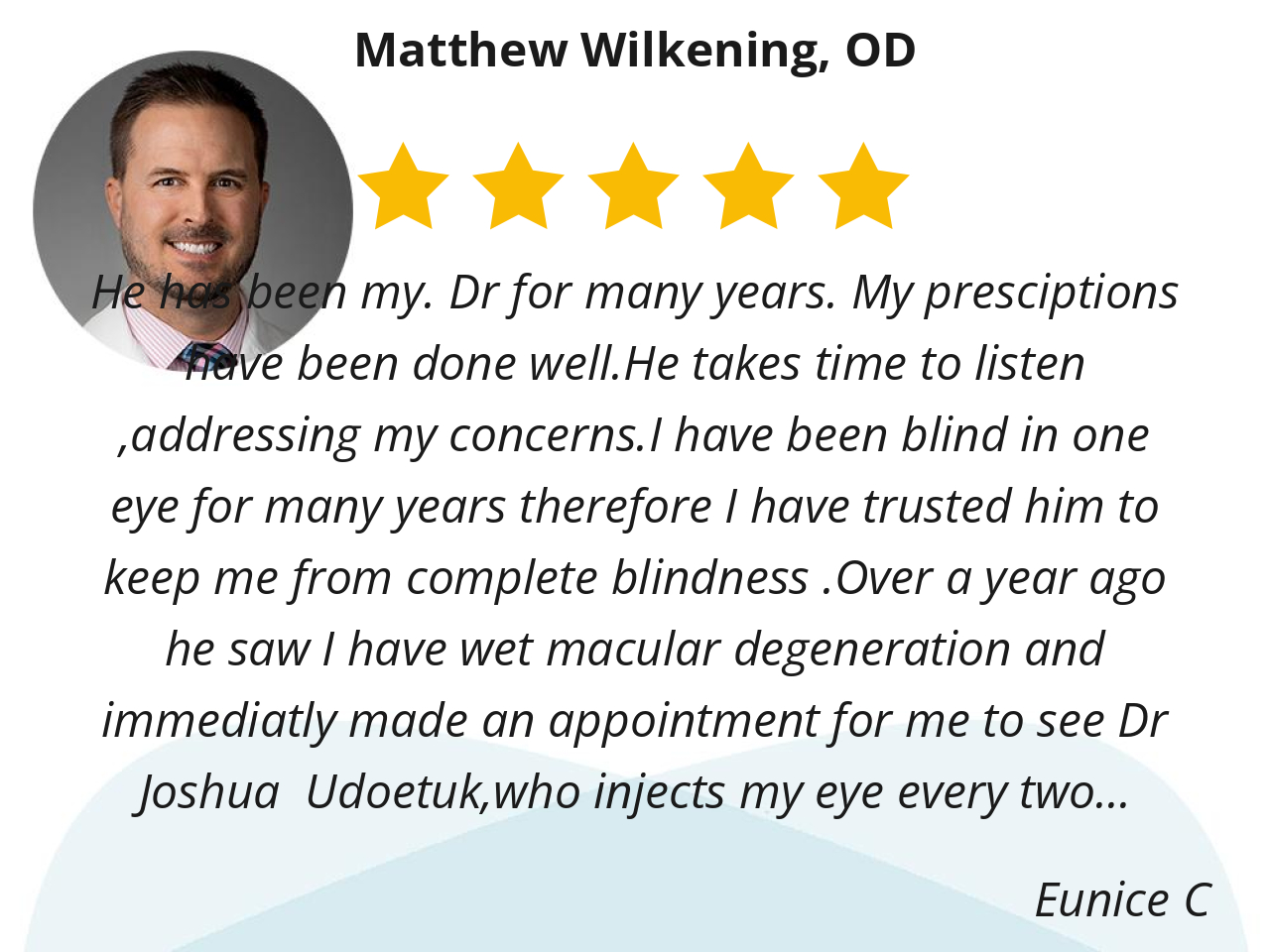 Dr. Wilkening is my preferred optometrist for years. I go out of my way for my eye exams with him because I trust his professional ability and advice. I believe he acts in my best interest.