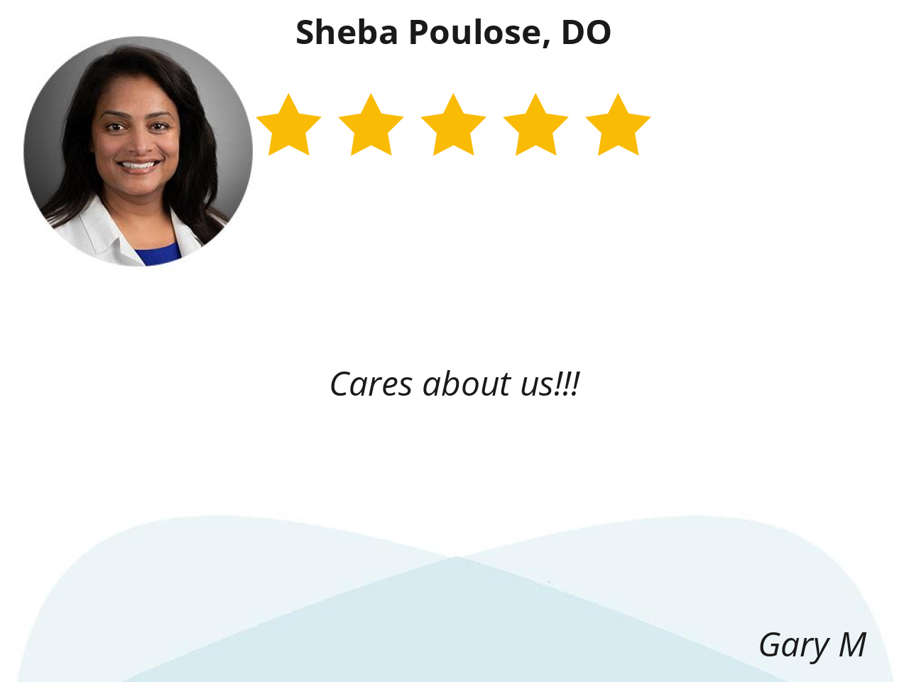 Dr. Poulose is very considerate and compassionate. She has good bed side manner's and she listens. All the while she's very professional. I also like her nurse, Nurse Frank... Even though I don't see Dr. Poulose a lot he always knows who I am, he's very patient and gentle with me. He listens well also and he genuinely seems concerned about me. They make a Great Team.