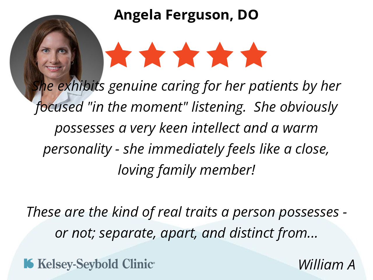 I have been going to Dr. Ferguson for many years. She's kind and very knowledgeable. She also has a great staff that spends a lot of time with their patients. I don't feel rushed when I am there.