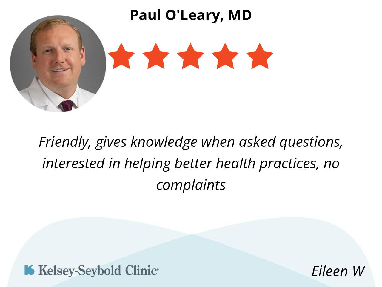 Dr. O’Leary is patient and knowledgeable. He is kind and full of wisdom. He takes his time to listen to me and does not chastise me when I gain weight and my blood with is off. He advocates for me. He takes the time to tell me things that makes sense so that I’ll agree. When he leaves Kelsey, I’m leaving Kelsey.