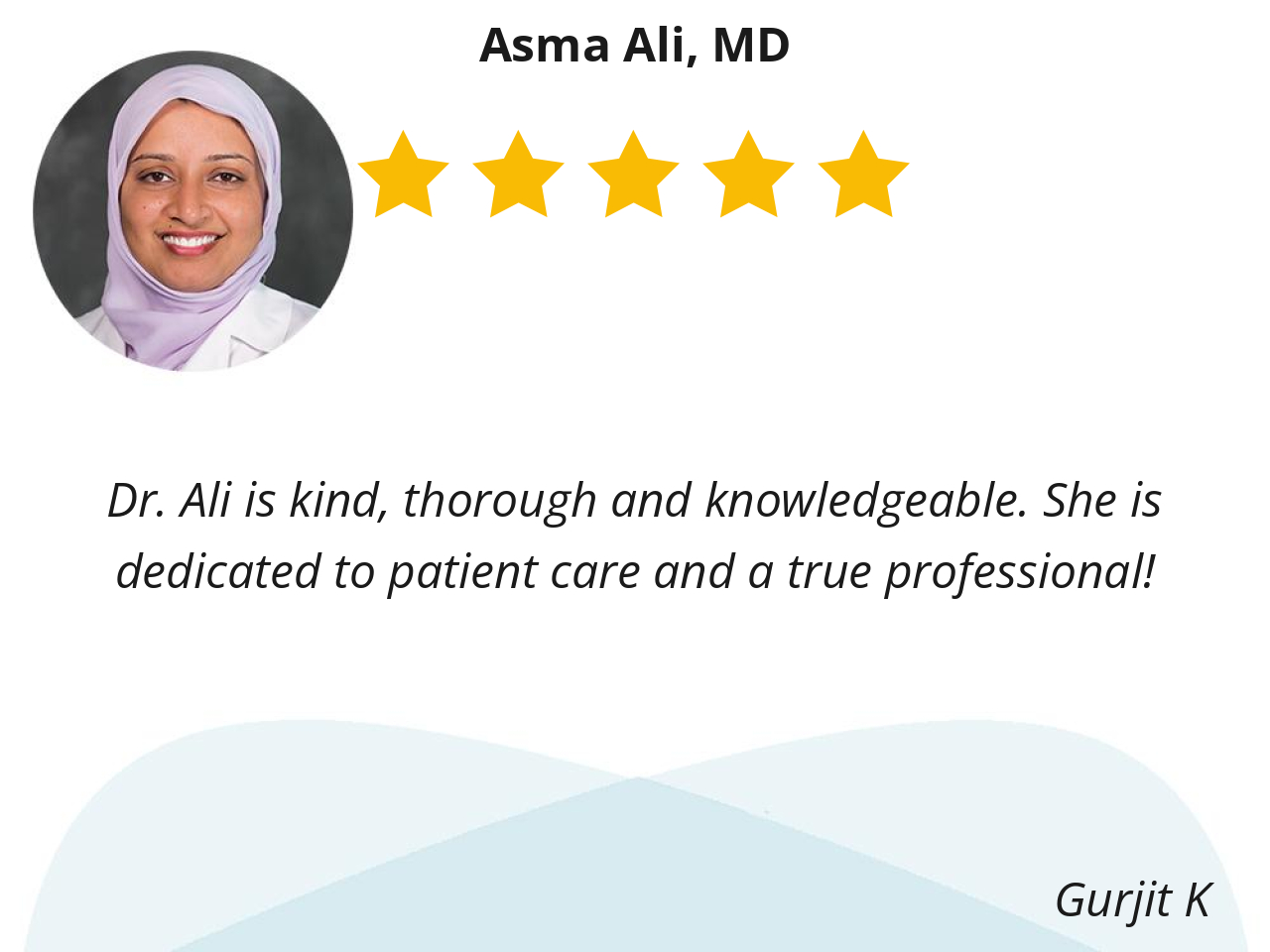 Dr. Ali is kind, thorough and knowledgeable. She is dedicated to patient care and a true professional!