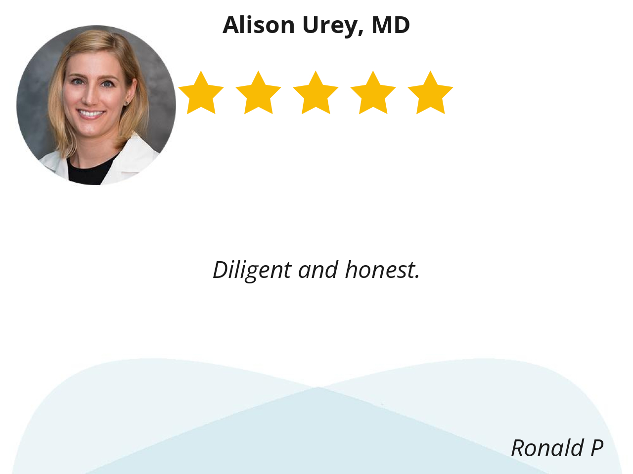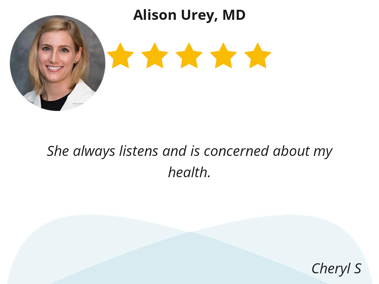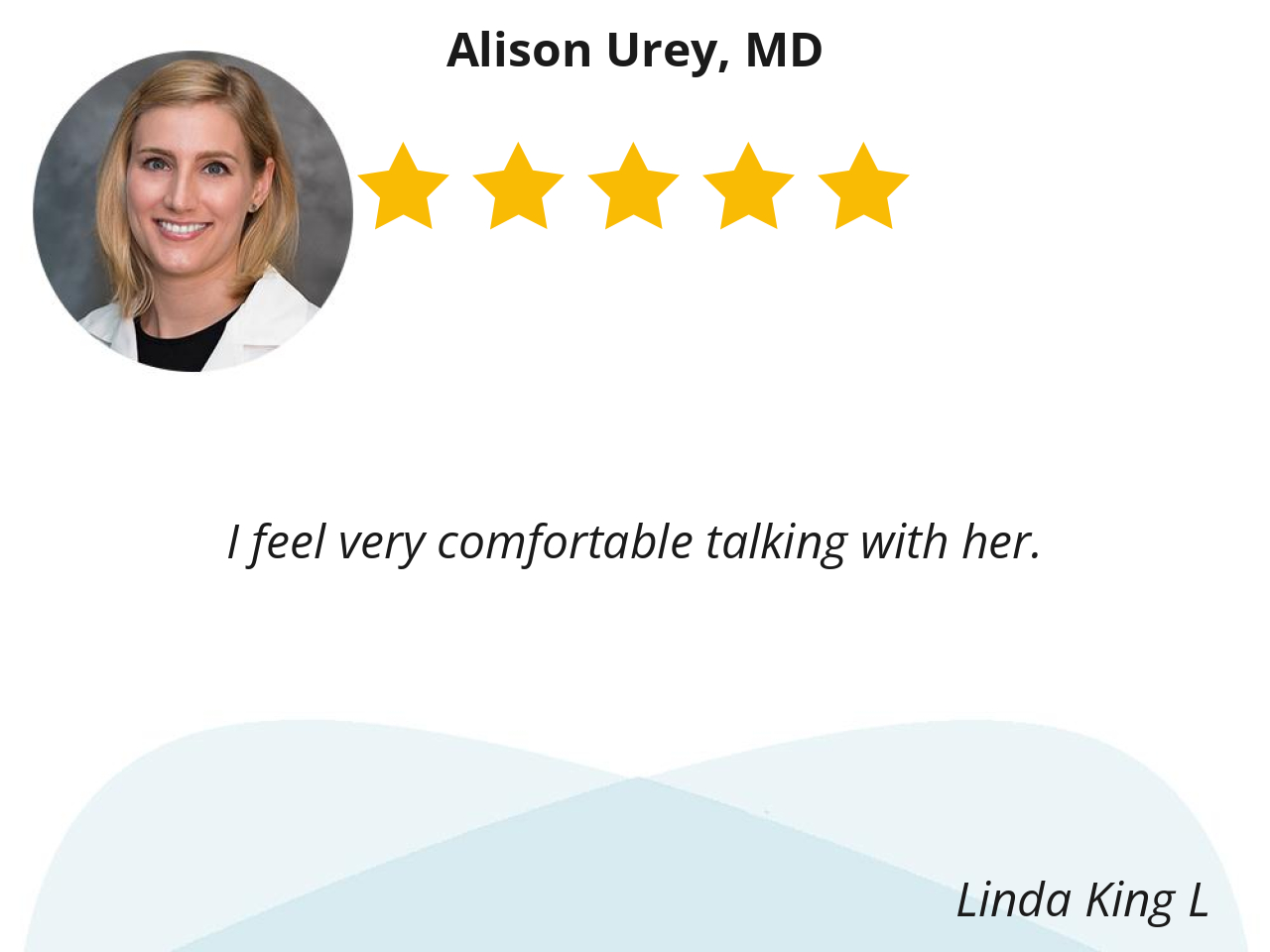 Dr. Urey takes trouble to make sure that we both understand what we’re each to saying. She is very informative and thorough. Responds quickly and decisively to question and requests. I have great faith in her.