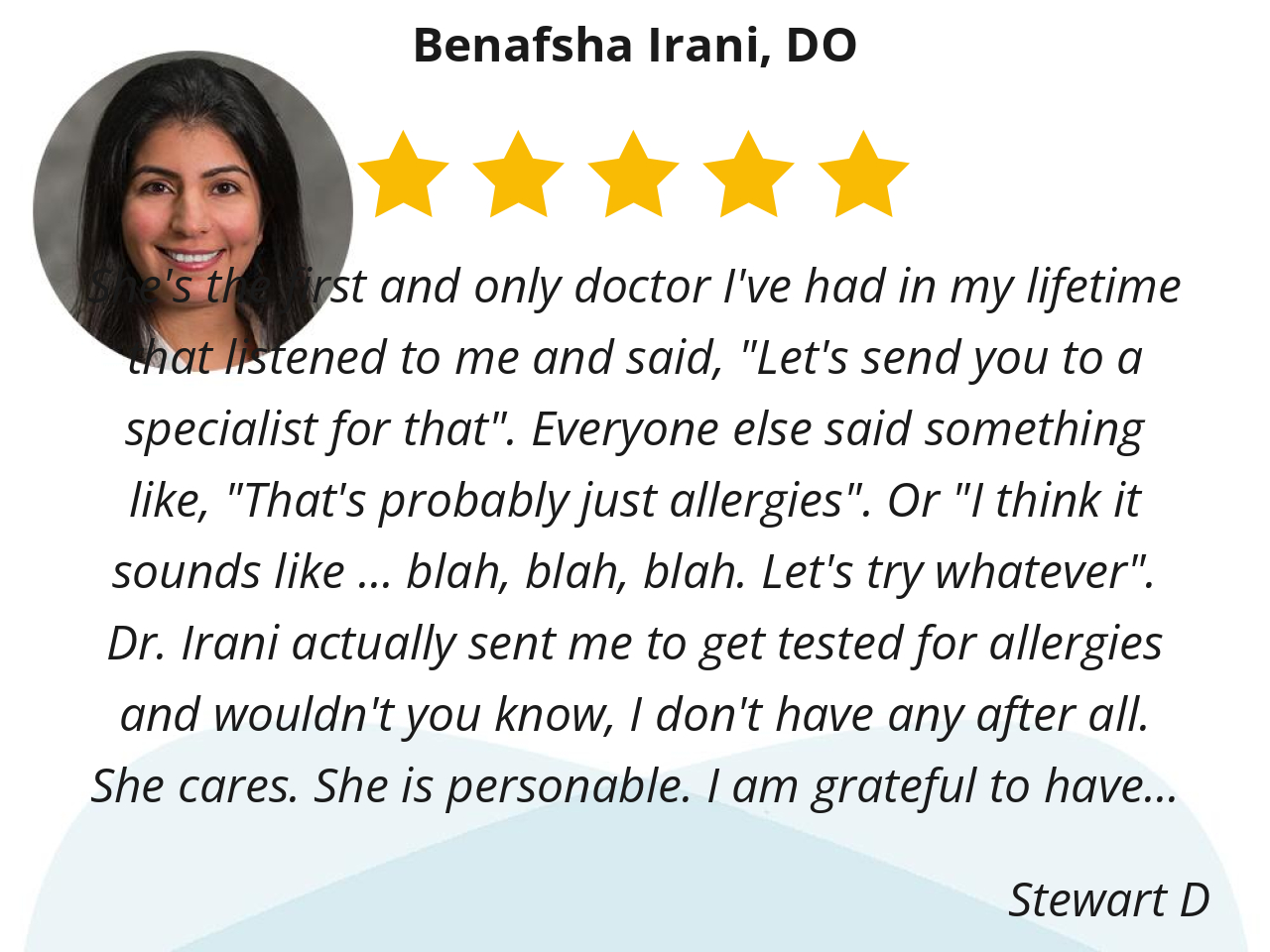 She's the first and only doctor I've had in my lifetime that listened to me and said, "Let's send you to a specialist for that". Everyone else said something like, "That's probably just allergies". Or "I think it sounds like ... blah, blah, blah. Let's try whatever". Dr. Irani actually sent me to get tested for allergies and wouldn't you know, I don't have any after all. She cares. She is personable. I am grateful to have her as my doctor.