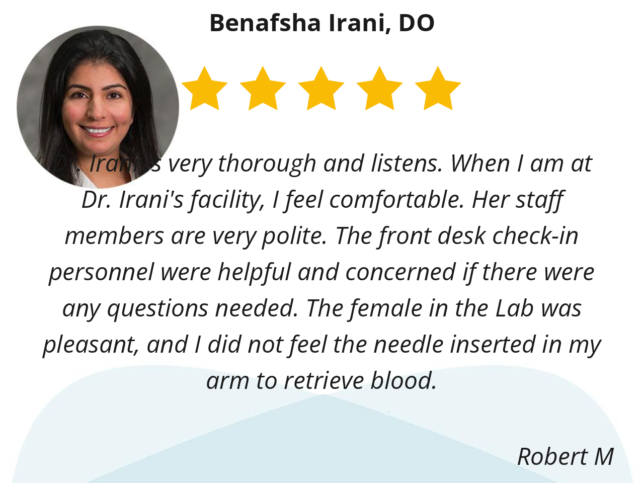Dr. Irani is very thorough and listens. When I am at Dr. Irani's facility, I feel comfortable. Her staff members are very polite. The front desk check-in personnel were helpful and concerned if there were any questions needed. The female in the Lab was pleasant, and I did not feel the needle inserted in my arm to retrieve blood.