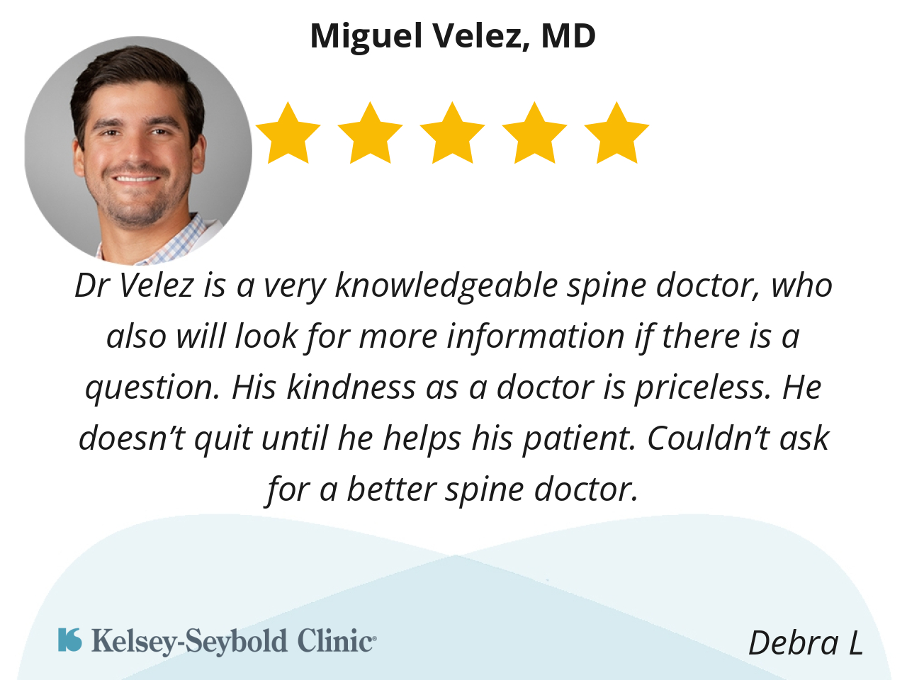 Dr Velez is a very knowledgeable spine doctor, who also will look for more information if there is a question. His kindness as a doctor is priceless. He doesn’t quit until he helps his patient. Couldn’t ask for a better spine doctor.