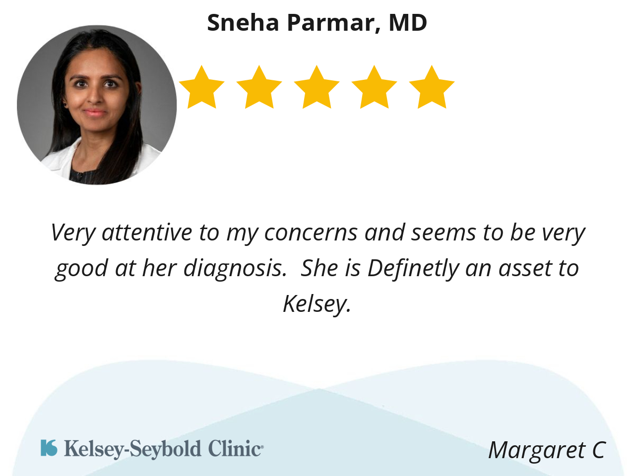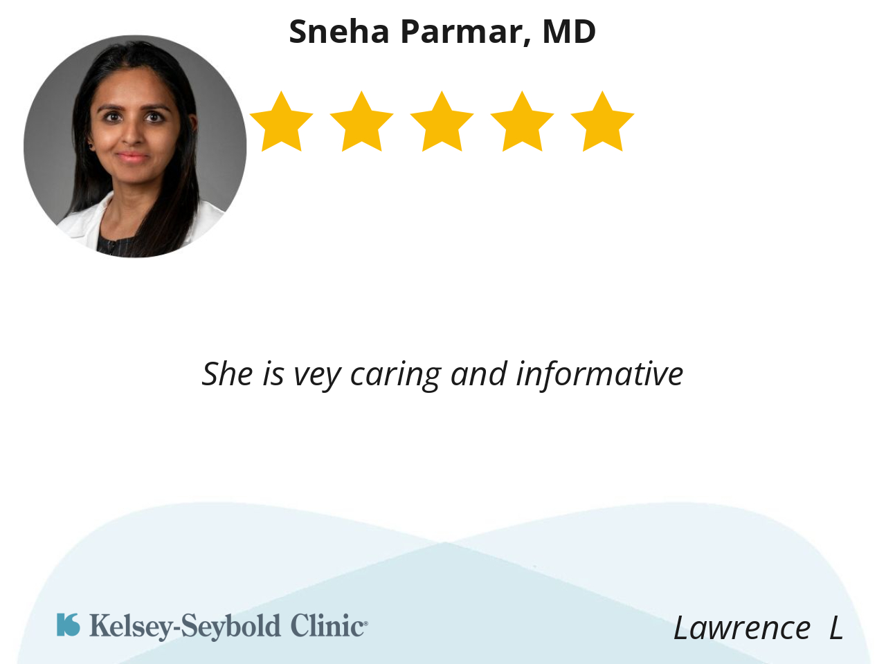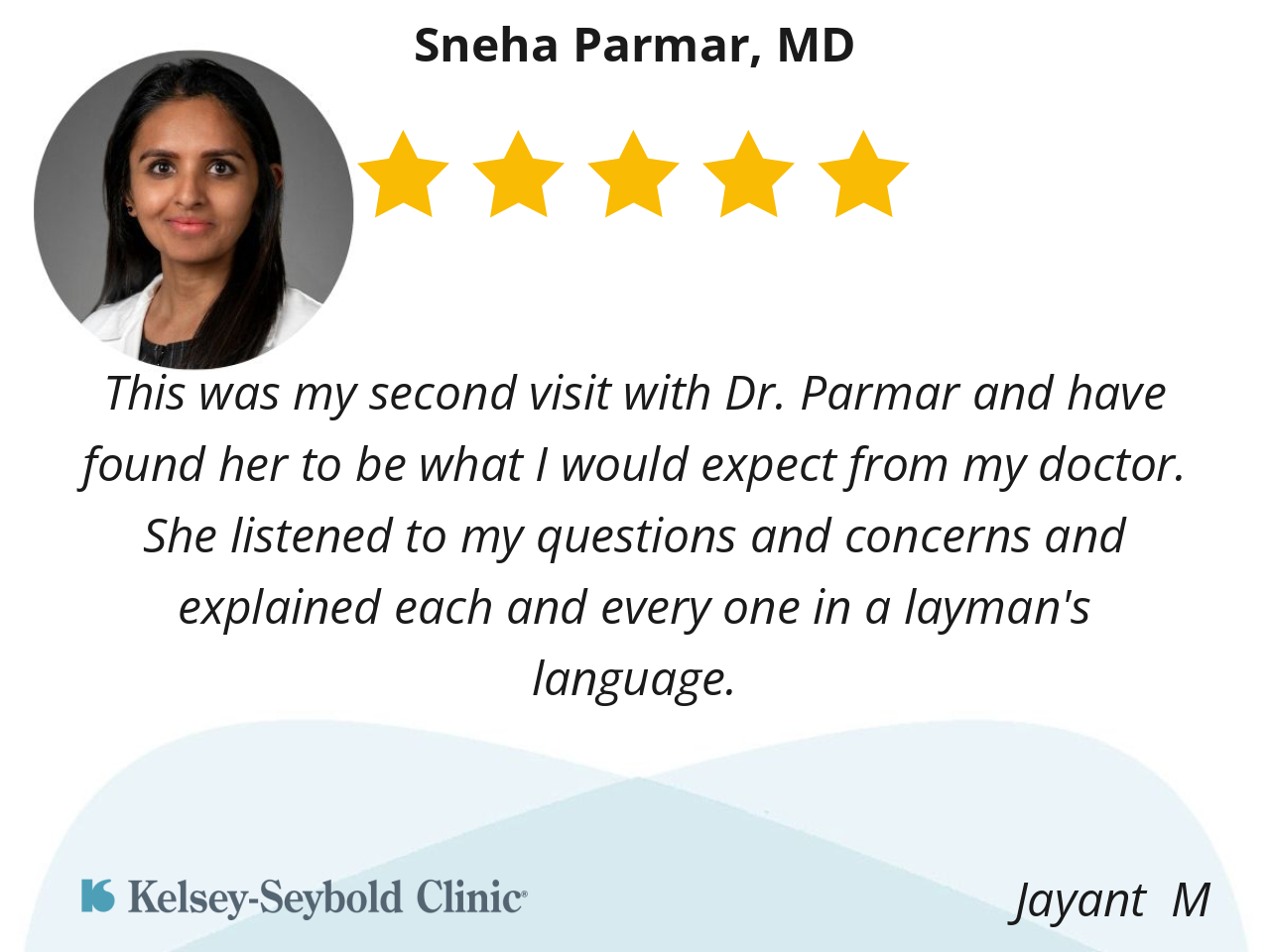 This was my second visit with Dr. Parmar and have found her to be what I would expect from my doctor. She listened to my questions and concerns and explained each and every one in a layman's language.
