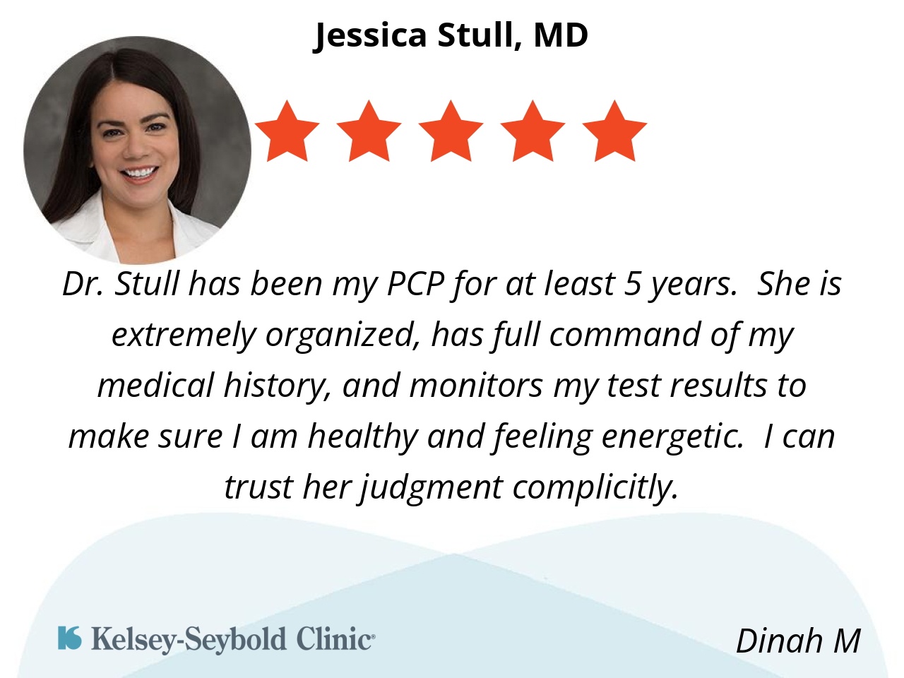 Dr. Stull has been my PCP for at least 5 years. She is extremely organized, has full command of my medical history, and monitors my test results to make sure I am healthy and feeling energetic. I can trust her judgment complicitly.
