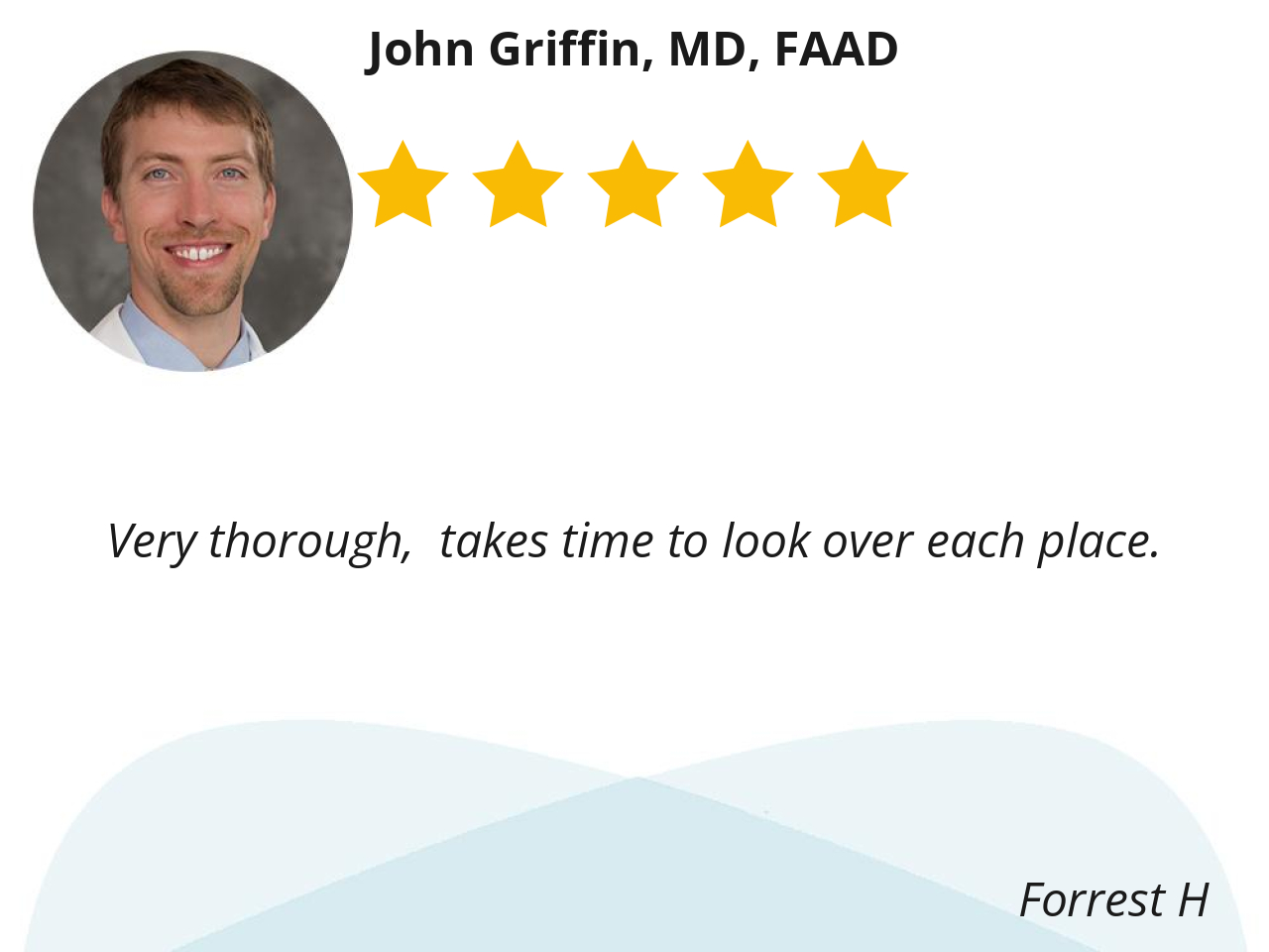 Dr. Griffin has excellent people skills from the time he enters the room with his assistant and until he leaves. He immediately took a speciman from a black mole on my foot and called me a week later to tell me it is cancer. Dr. Griffin immediately started the process of getting me with the right Dr. to perform the surgery.