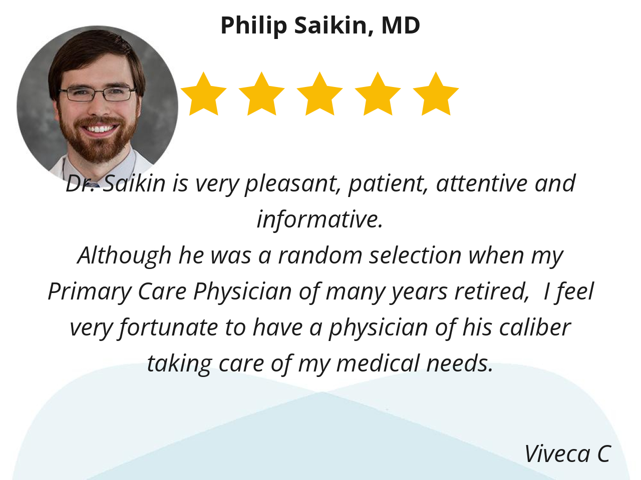 Dr. Philip Saikin has been my Primary Care Physician for several years now and he’s an Awesome doctor! He’s very compassionate, professional, caring, concerned and very knowledgeable. He takes time to discuss and addresses all my concerns and health issues with detailed information. I truly appreciate him assisting me and I’m Blessed to have him as my doctor. Thanks Dr. Saikin for all you doing to help me get back to a normal lifestyle. He always provides me with excellent service and solutions to my concerns. “Yes, I “highly recommend”Dr. Saikin to others! His Nurses are AWESOME, friendly, professional, nice, compassionate and very caring
