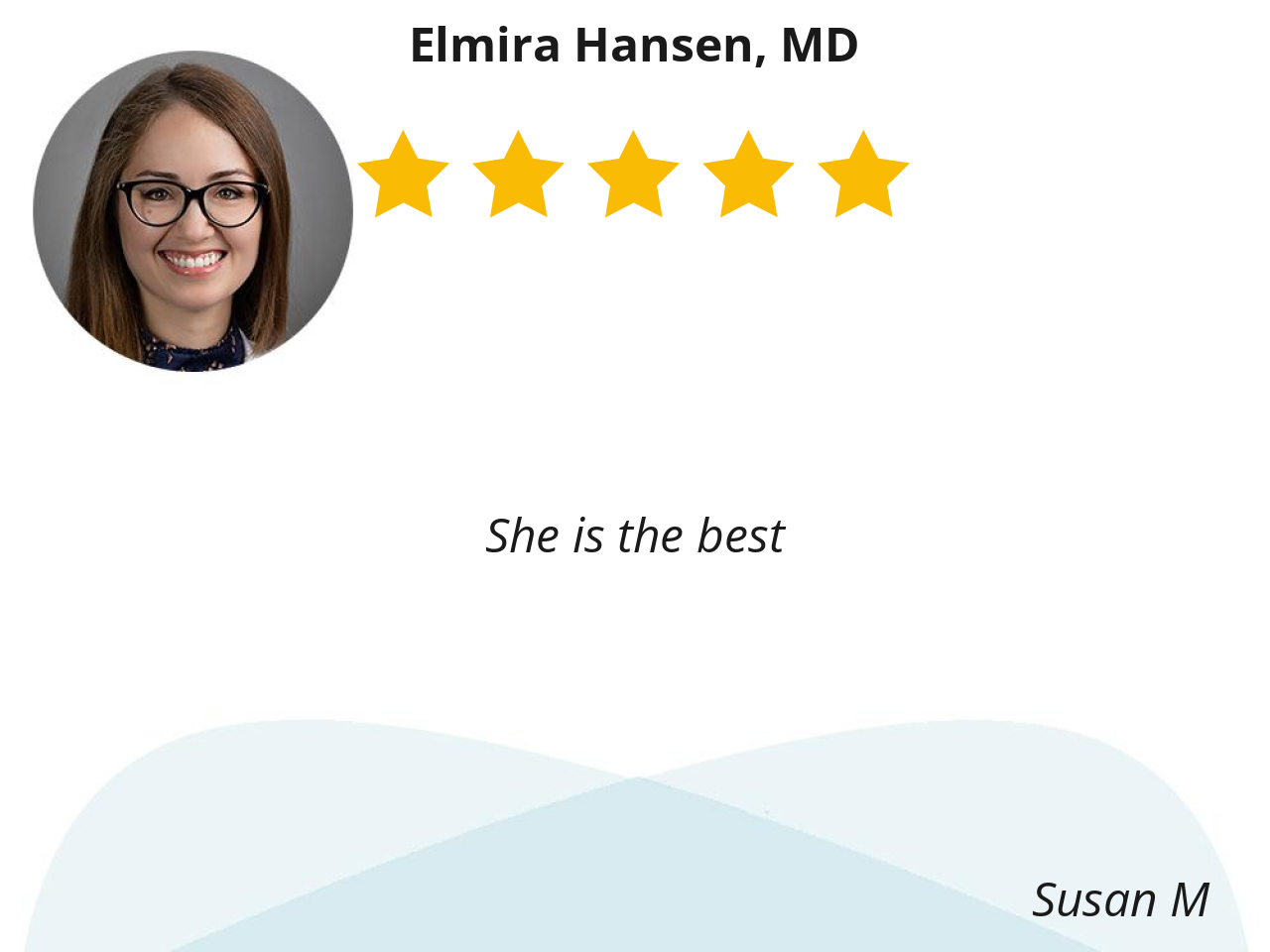 Dr. Elmira Hansen explains everything to me until she is sure I understand and she's very patient with me when I ask question after question. She is very compassionate and understanding.