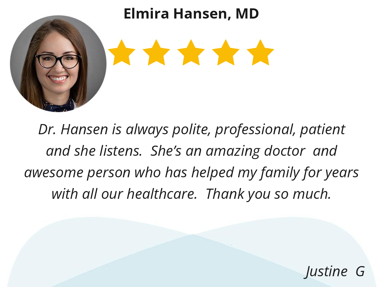 Dr. Hansen is always polite, professional, patient and she listens. She’s an amazing doctor and awesome person who has helped my family for years with all our healthcare. Thank you so much.