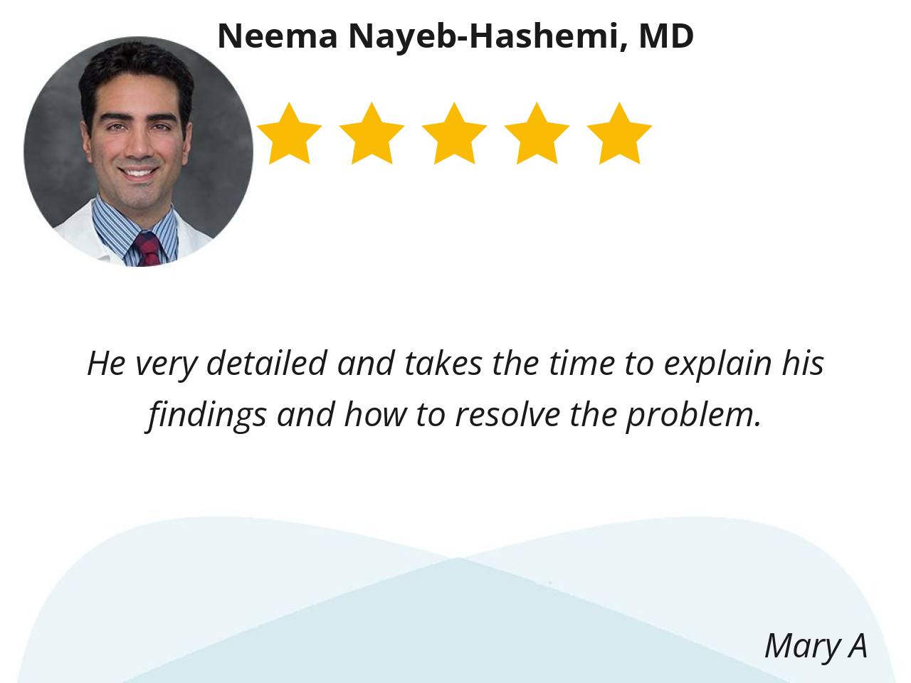 Dr. Hashemi is very thorough. He answers all questions and tells me all the options and does it in a kind and caring manner.