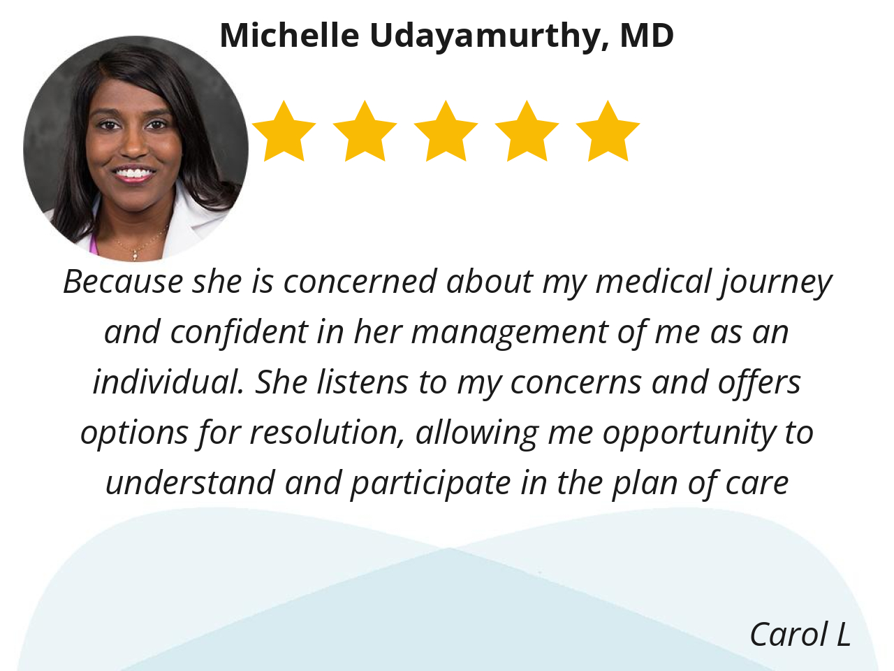 Dr. Udayamurthy is a hands on doctor, available and ready to assist. Very knowledgable in her field of work. Thoroughly listens to your concern and addresses them appropriately. She’s compassionate & kind, friendly & warm. I’m happy to be her patient and I know I’m getting the best care and I trust her whole-heartily!