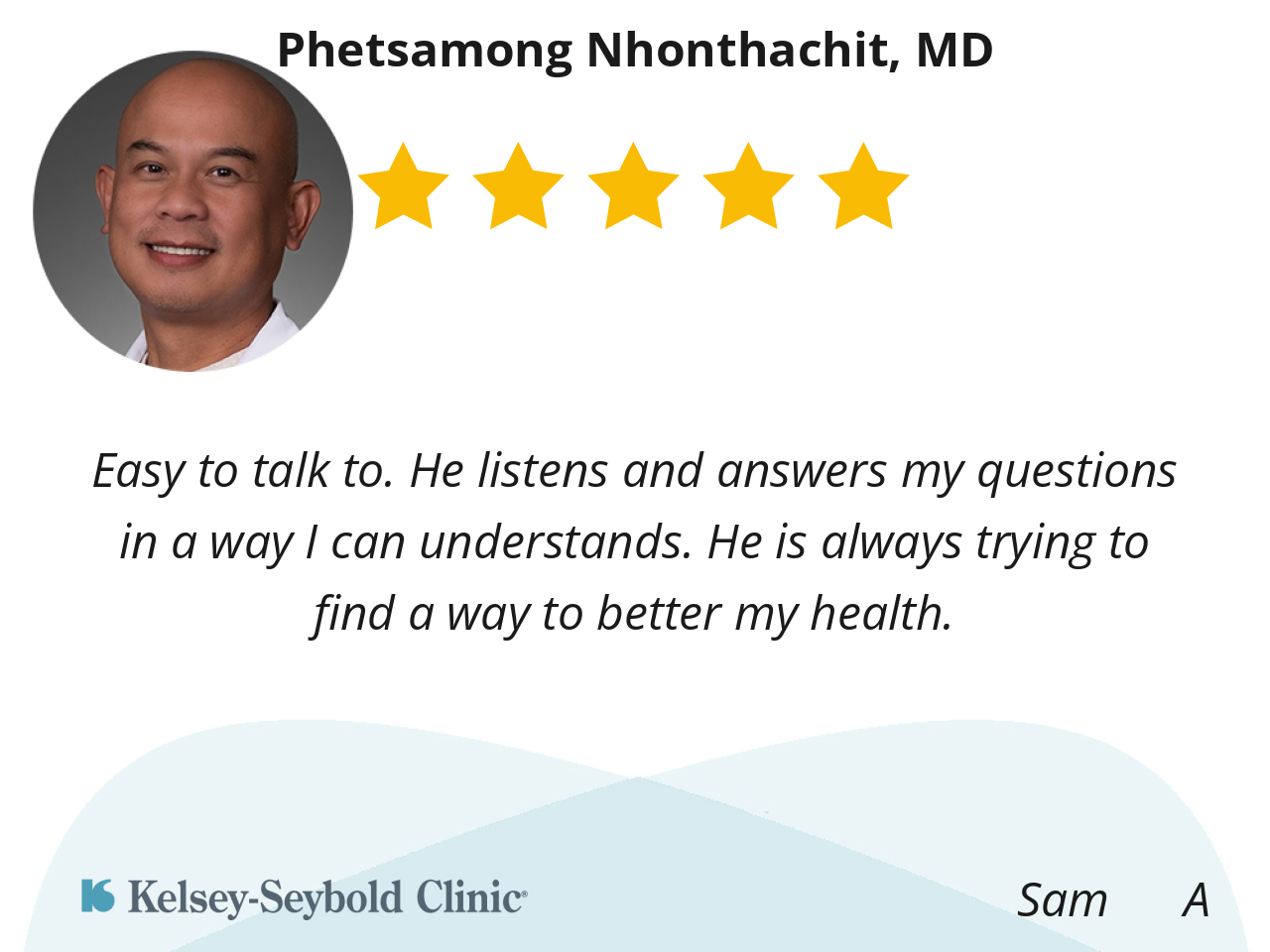 I like Dr. Nhonthachit because every time I have a visit with him he takes the time to hear out my problems, he explains everything in detail, he’s very personable, knowledgeable and he makes you feel like he really cares about your health.