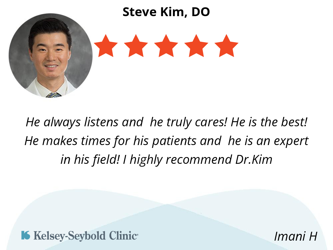He always listens and he truly cares! He is the best! He makes times for his patients and he is an expert in his field! I highly recommend Dr.Kim