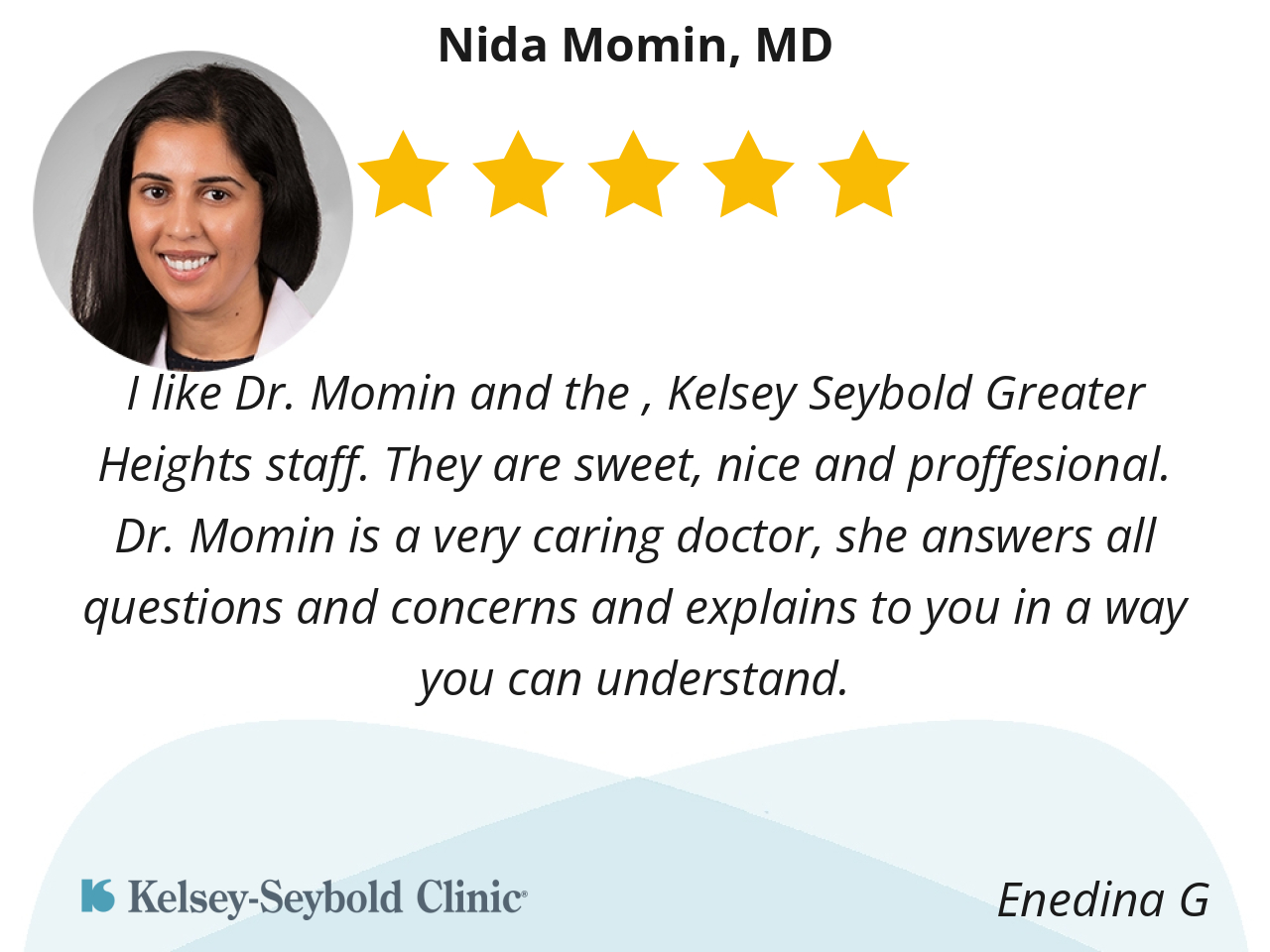 I like Dr. Momin and the , Kelsey Seybold Greater Heights staff. They are sweet, nice and proffesional. Dr. Momin is a very caring doctor, she answers all questions and concerns and explains to you in a way you can understand.