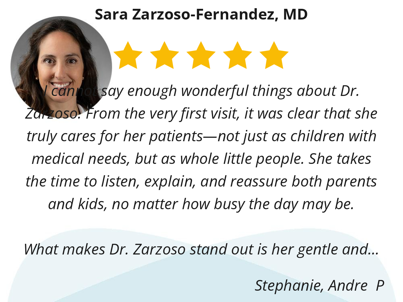 I cannot say enough wonderful things about Dr. Zarzoso. From the very first visit, it was clear that she truly cares for her patients—not just as children with medical needs, but as whole little people. She takes the time to listen, explain, and reassure both parents and kids, no matter how busy the day may be.