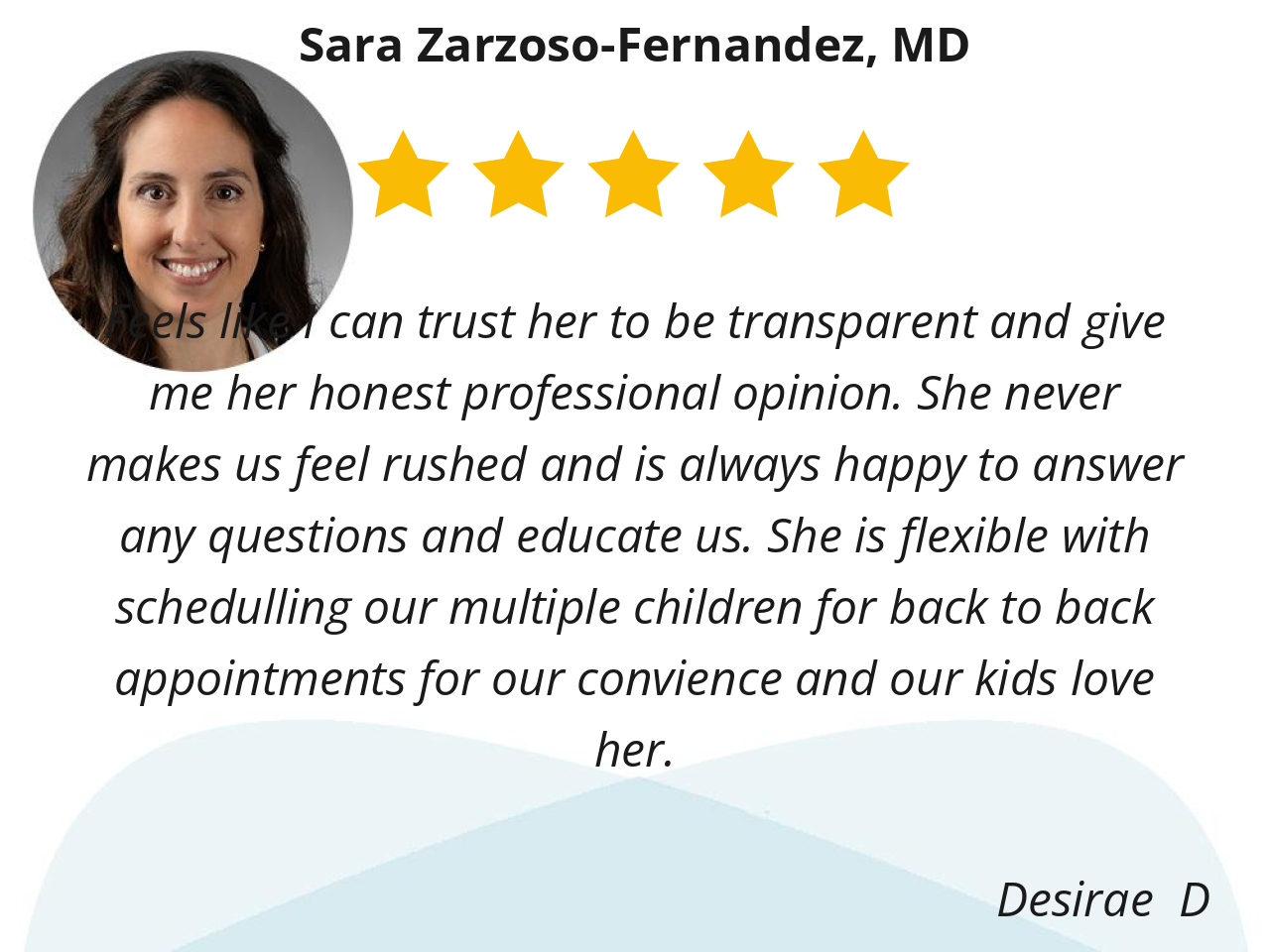What makes Dr. Zarzoso stand out is her gentle and compassionate approach. She always speaks directly to my child first, making them feel comfortable and respected, and then takes the time to answer every one of my questions with patience. She never rushes us and goes out of her way to make sure we leave the office feeling confident and supported.