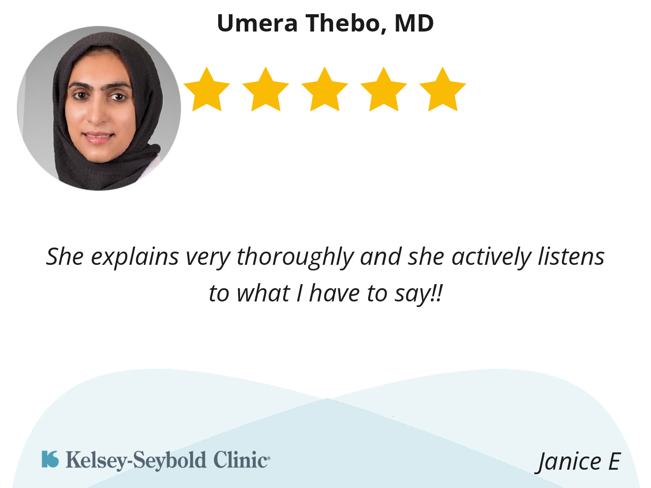 Dr Thebo is cares about my medical needs. She is professional and knowledgeable. She listens to my health concerns.