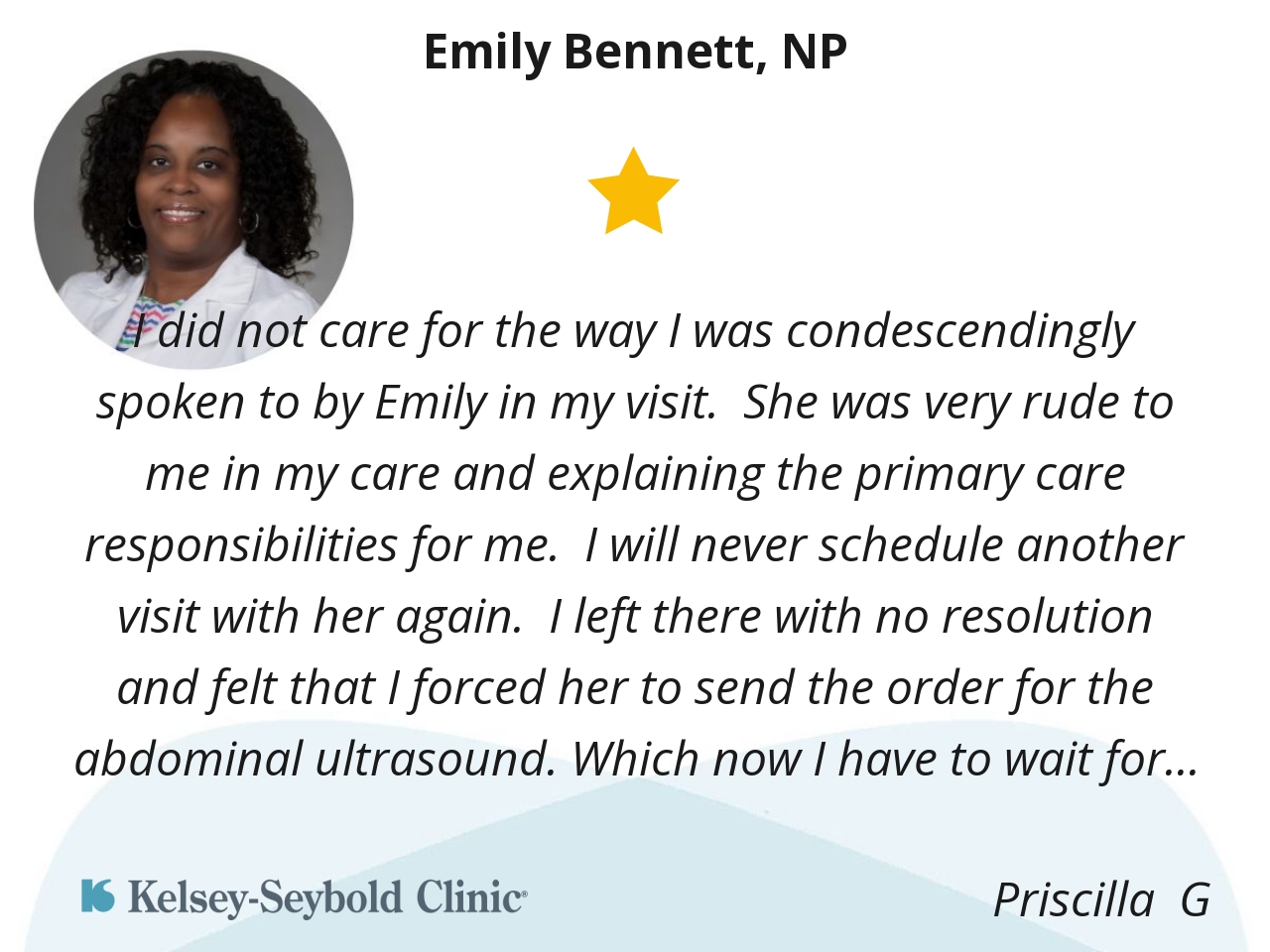My experience with Emily was great. She listened to my concerns and gave me a great explanation about the new medication I am starting. Her bedside manner was warm and welcoming and made me comfortable in her presence.