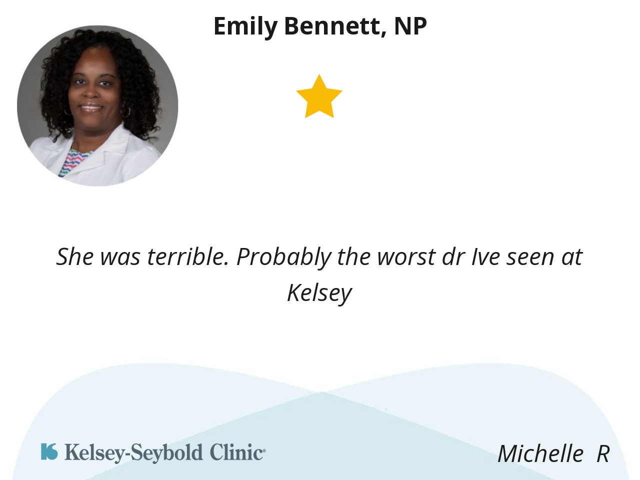 My experience with Emily was great. She listened to my concerns and gave me a great explanation about the new medication I am starting. Her bedside manner was warm and welcoming and made me comfortable in her presence.