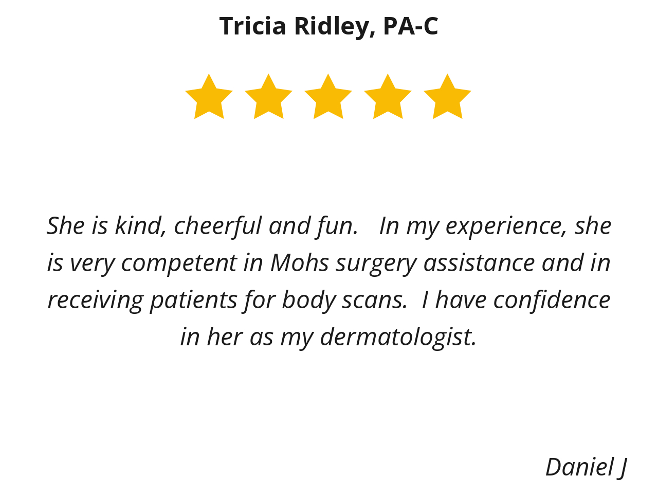 She is kind, cheerful and fun. In my experience, she is very competent in Mohs surgery assistance and in receiving patients for body scans. I have confidence in her as my dermatologist.