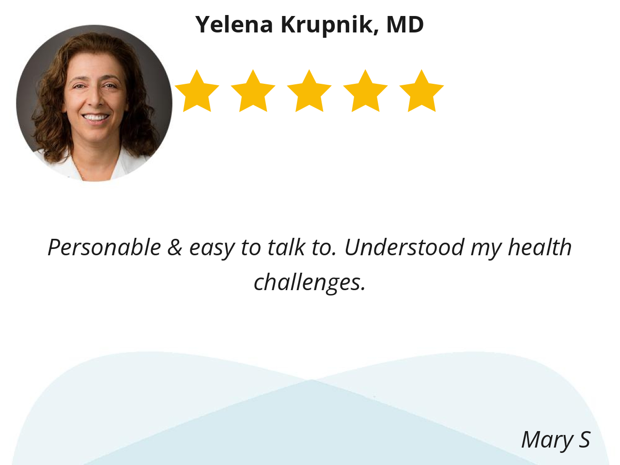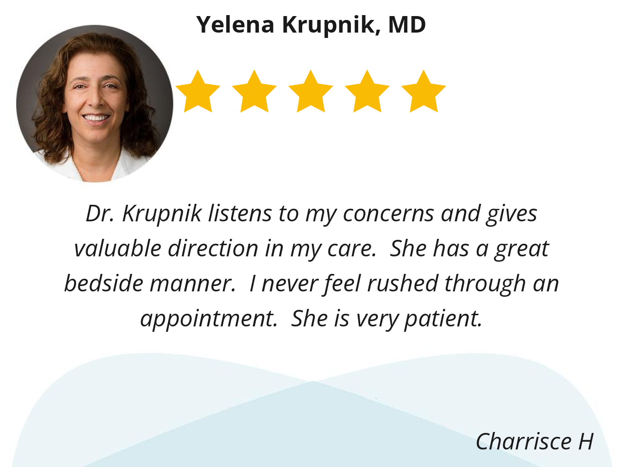 Dr. Krupnik listens to my concerns and gives valuable direction in my care. She has a great bedside manner. I never feel rushed through an appointment. She is very patient.