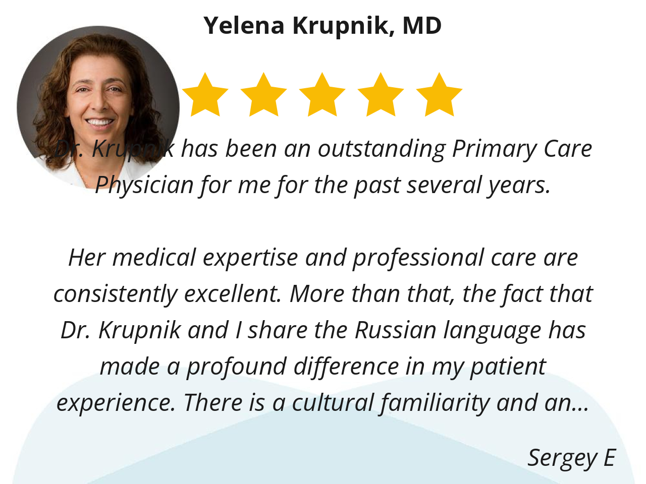 Her medical expertise and professional care are consistently excellent. More than that, the fact that Dr. Krupnik and I share the Russian language has made a profound difference in my patient experience. There is a cultural familiarity and an immediate connection that makes discussing sensitive health issues far less stressful. I feel there's a certain unspoken understanding in our conversations that goes beyond just the words. This level of personalized care, stemming from our shared background, is why I value Dr. Krupnik so highly and why I trust her with my health.