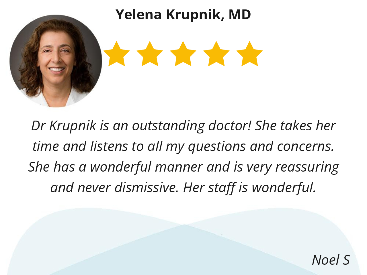 Dr. Krupnik always takes time to listen to me and address my concerns. She doesn’t appear to be rushed. I appreciate that. She’s very personable.