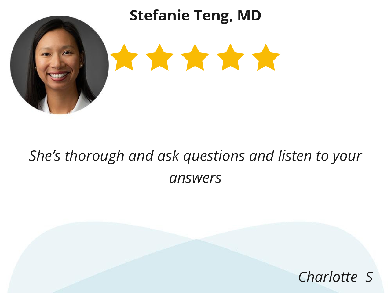 Dr Teng is very thorough. I never feel rushed and she answers all questions completely. She always follows up to be sure your problem has been resolved.
