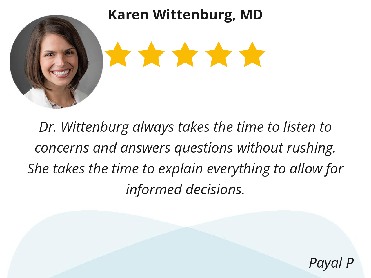 Dr. Wittenburg always takes the time to listen to concerns and answers questions without rushing. She takes the time to explain everything to allow for informed decisions.