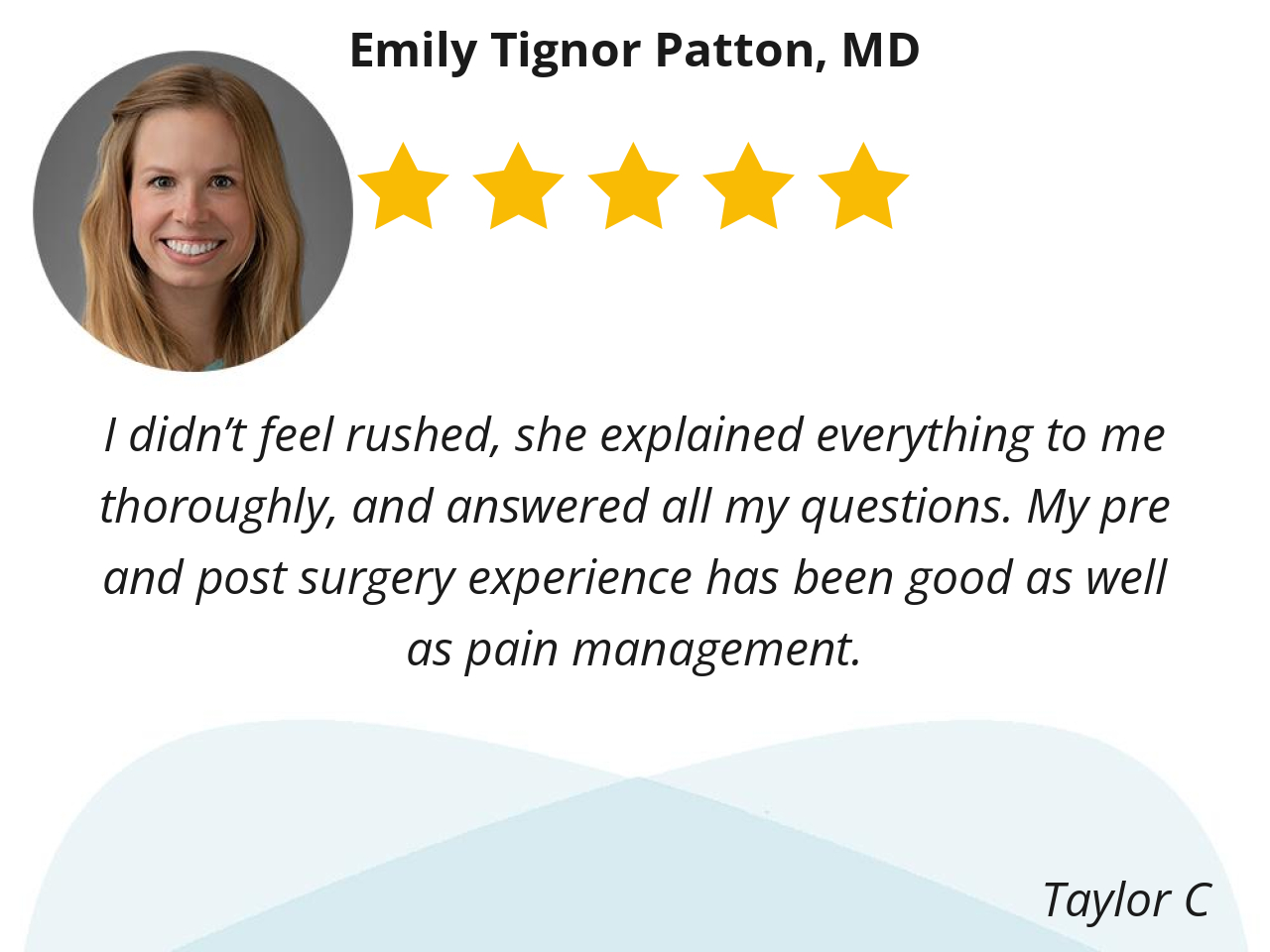 I didn’t feel rushed, she explained everything to me thoroughly, and answered all my questions. My pre and post surgery experience has been good as well as pain management.